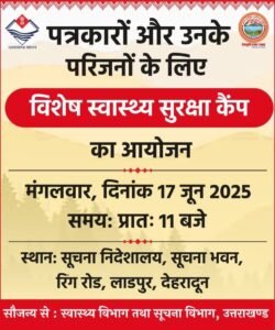 उत्तराखण्ड में पत्रकारों और उनके परिजनों के लिए मुख्यमंत्री धामी की बड़ी पहल 17 जून मंगलवार को 11 बजे से...
