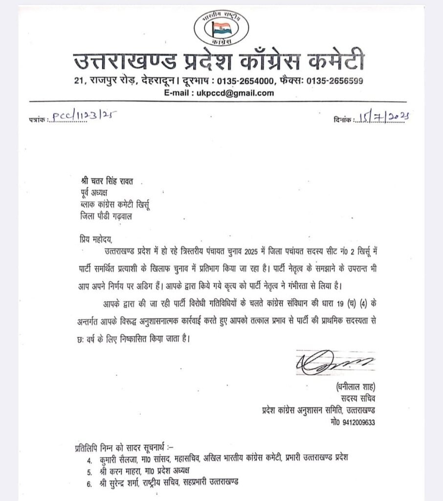 उत्तराखंड कांग्रेस कमेटी की ओर से लम्बे समय से पार्टी विरोधी गतिविधियों में संलिप्त तीन पार्टी नेताओं को तत्काल प्रभाव से कांग्रेस पार्टी की प्राथमिक सदस्यता से 6 साल के लिए निष्कासित किया गया है।